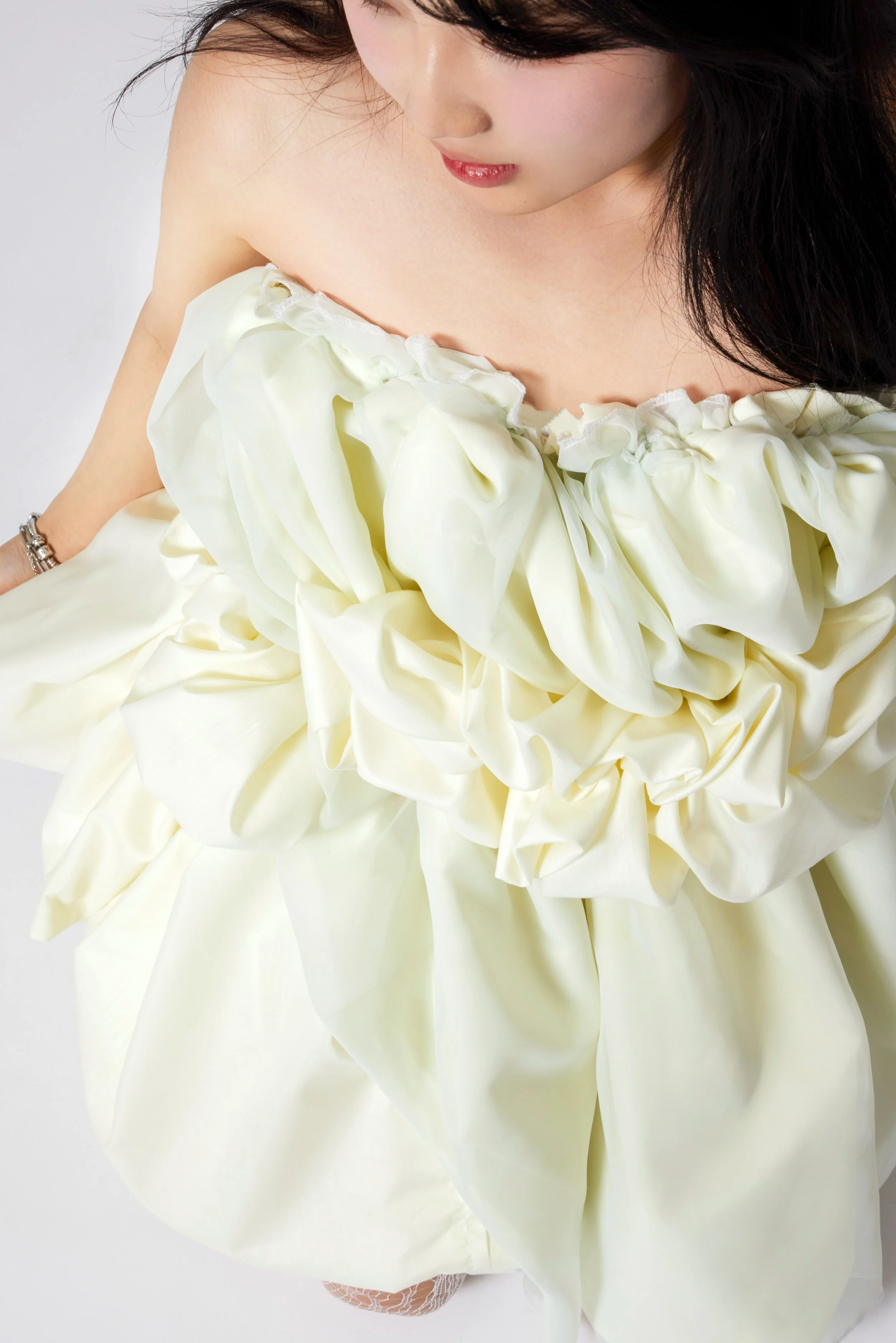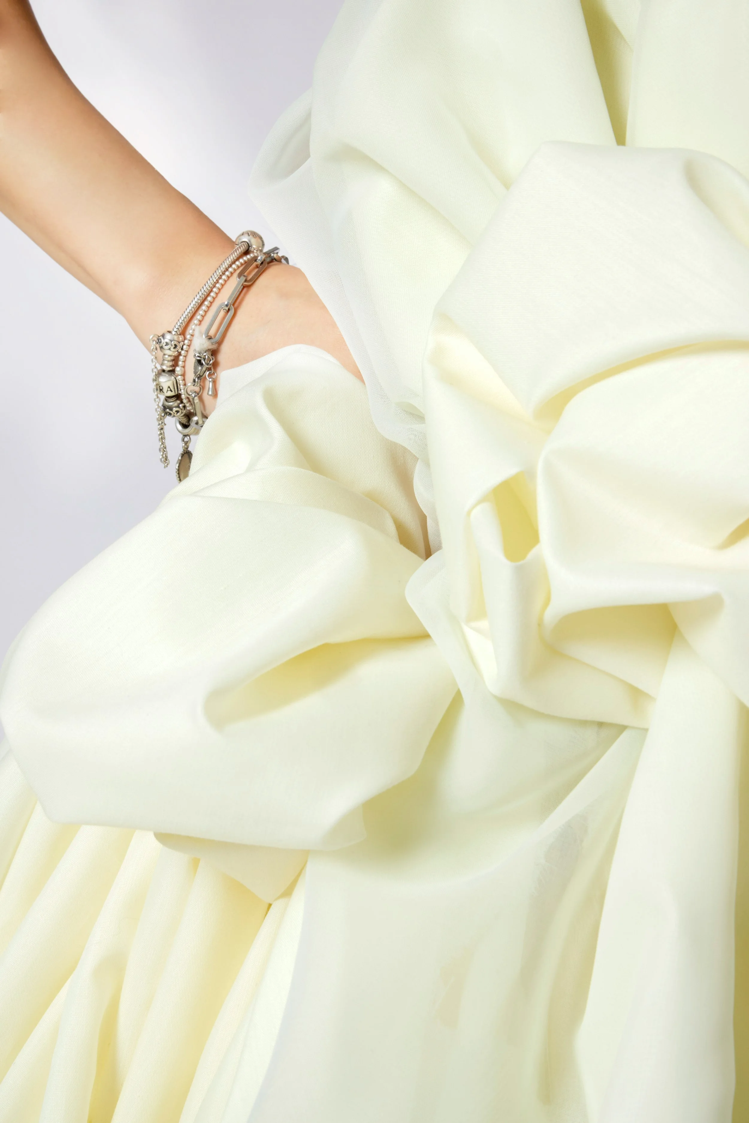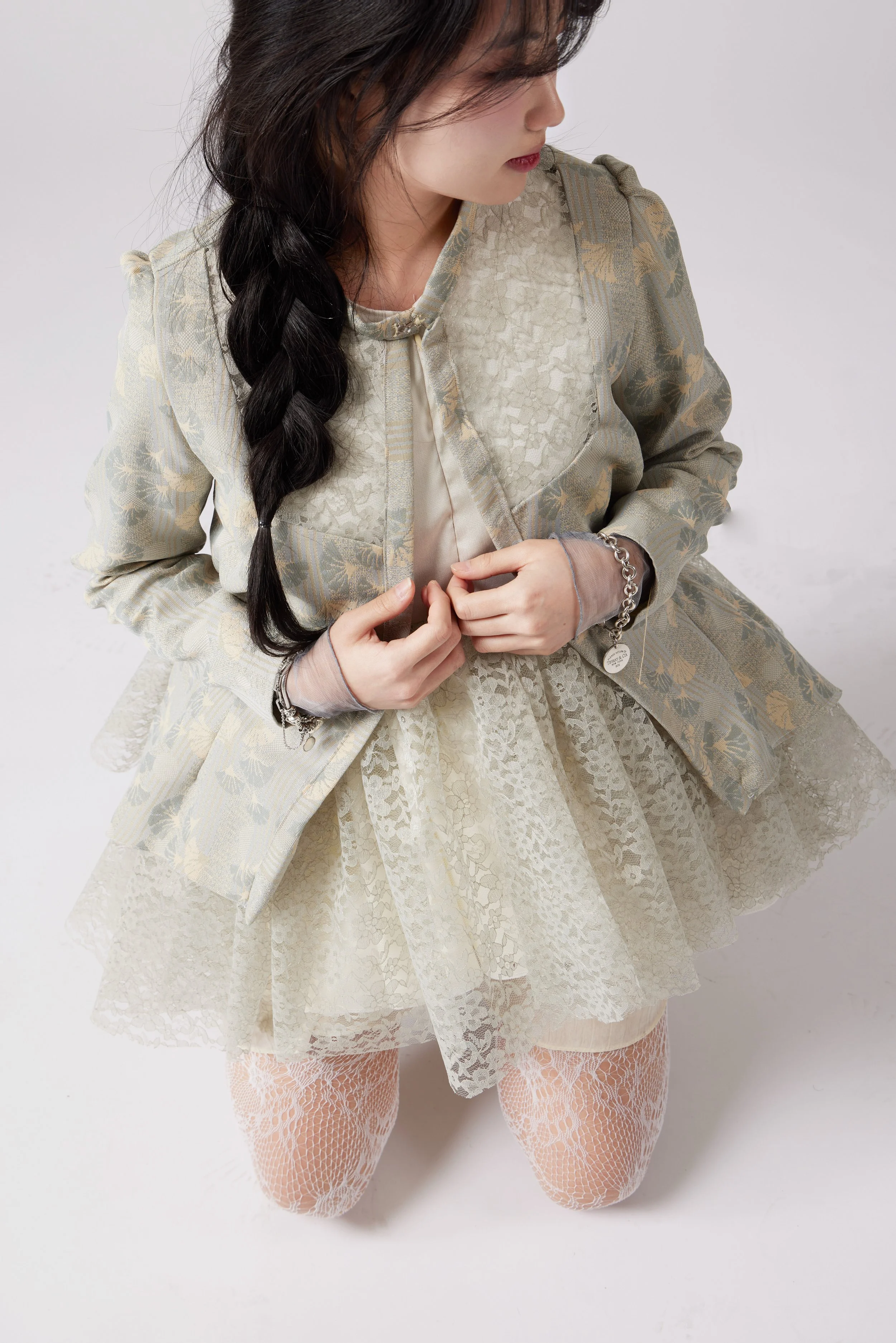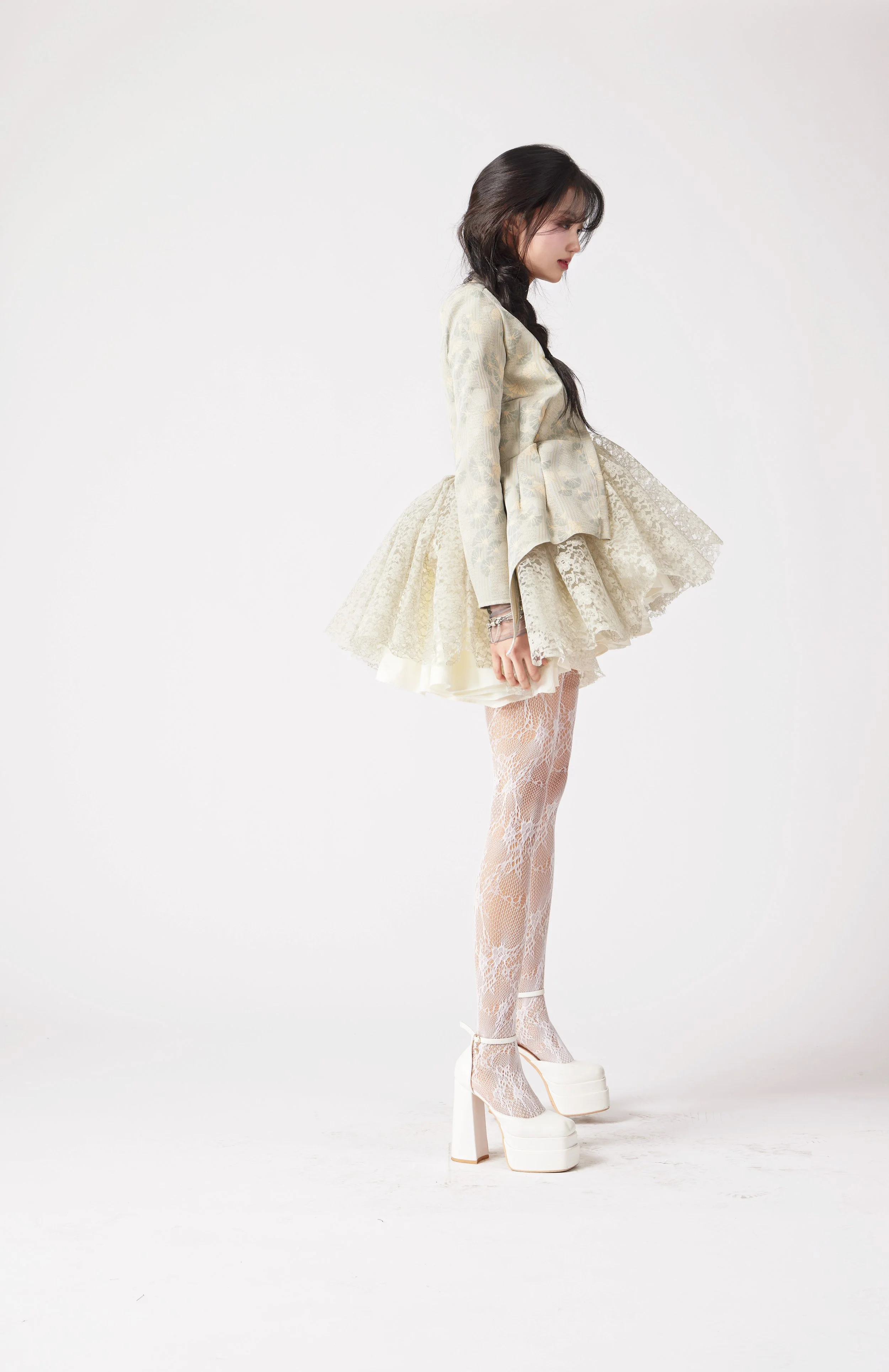 Silhouettes drift between worlds—neither fully anchored nor entirely free. They cocoon the body in layers of air and silence, with translucent fabrics like chiffon, tulle, and lace becoming veils of memory, mist, and emotion. Jacquard adds tactile echoes of the subconscious—rich, intricate, and impossible to decipher at a glance.